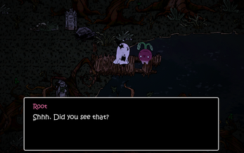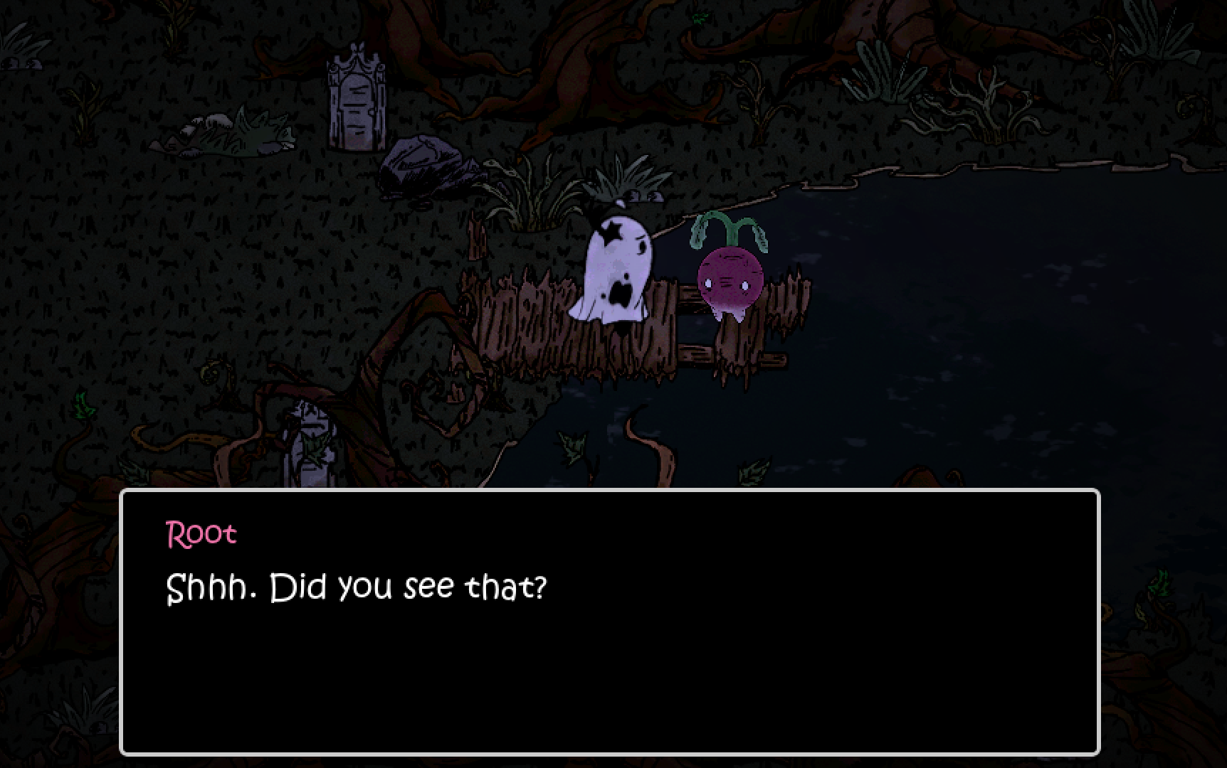 A trembling turnip who spends his days staring into the lake, horrified by what he sees in his reflection. Timid, paranoid, and easily startled, Root is convinced the lake is watching him. And, probably, it is.